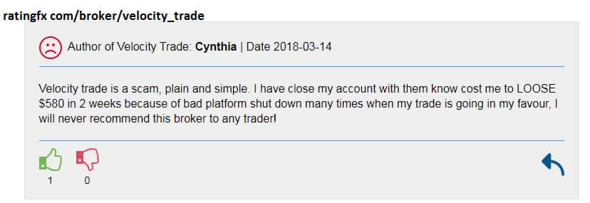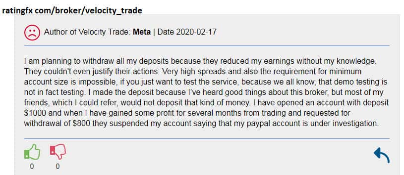 Мошенническая контора Velocity Trade имеет целый ряд недостатков, которые должны как минимум настораживать пользователей. Во-первых, минимальная ставка депозита составляет 1000$ и демо-тестирование не дает абсолютно никаких гарантий, что брокер не кинет вас с вашим депозитом. Такие инвестиции слишком рисковые в начале сотрудничества с брокером!