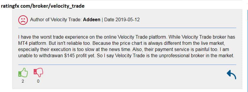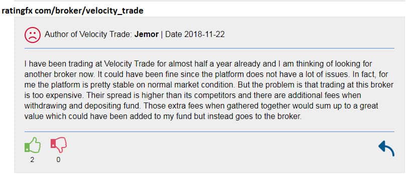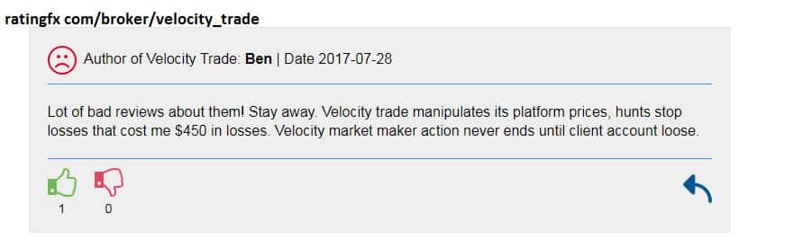 Шаражкина контора Velocity Trade всячески наживается на инвестициях и торговых сделках своих трейдеров. Поступают многочисленные отзывы о том, что лохокухня Velocity Trade завышает стоимость спредов и вводит огромную скрытую комиссию. А также жулики постоянно ведут нечестную деятельность, не закрывают вовремя ордера и дают ложные рыночные цены!