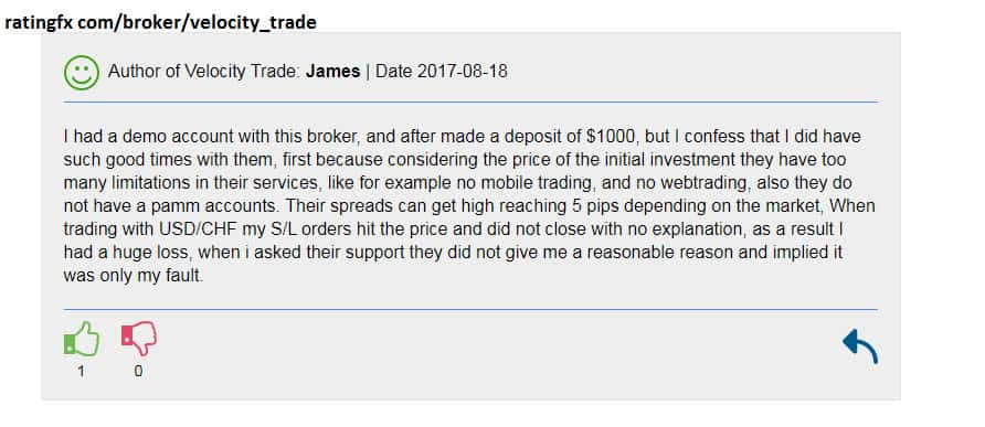 Псевдоброкер Velocity Trade перекладывает всю вину за убытки на самих трейдеров. Бывают различные ситуации, когда сам трейдер совершил ошибку и несет убытки. Но когда торговая платформа начинает зависать в момент совершения сделки или вовремя не берется в исполнение ордер - это полностью компетенция брокера! Velocity Trade убеждают в обратном!