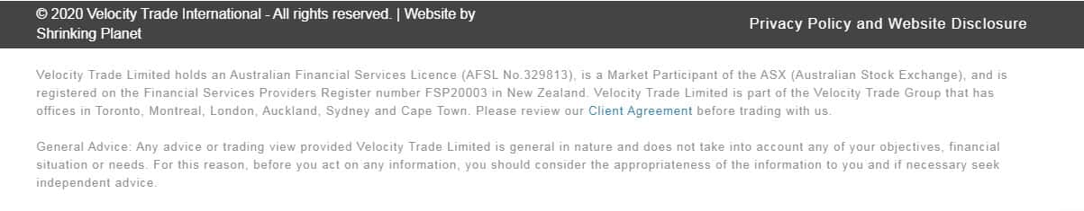 При детальном изучении деятельности конторы Velocity Trade можно найти информацию о том, что контора имеет лицензию. И не одну, а для каждой страны, в которой Velocity Trade ведет деятельность, отдельная лицензия. К сожалению, на официальном сайте данной информации нет! Зато есть никому не заметная мелкая сноска с якобы номером лицензии!