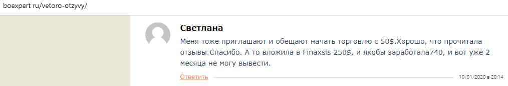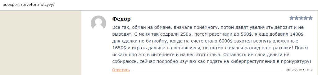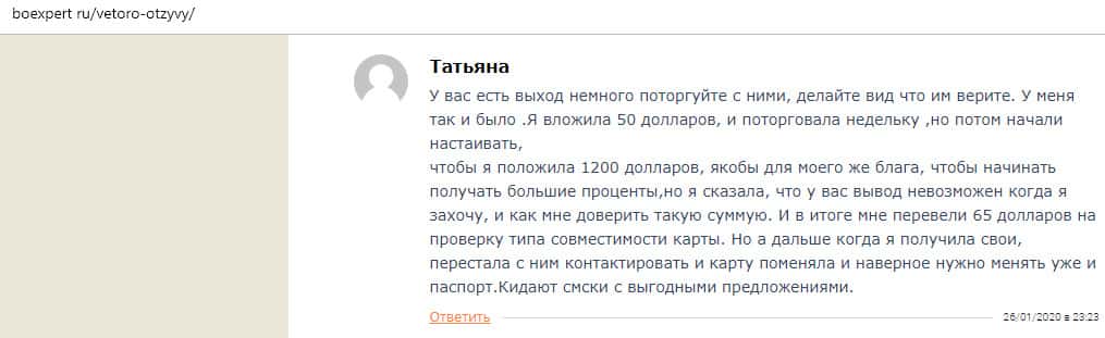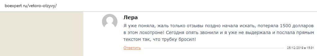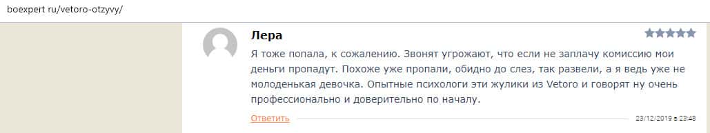 Еще один коротенький отзыв был найден в интернете, который комментировать нет даже смысла. В нем сказано, что лохотрон Vetoro io - это настоящий лохотрон и там работают профессиональные мошенники. В данном случае клиентка жалуется, что аферисты вымогают у нее вложить 50 долларов.