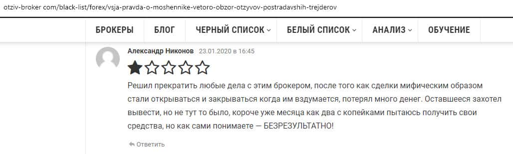 Ниже представлен отзыв от человека, который решил прекратить вообще любые дела с брокерской конторой Веторо. Аферисты просто стали беспредельничать на его торговом счете и таким образом все было слито под ноль. Он пытается вывести хотя бы остатки, но заявка до сих пор висит не обработанная.