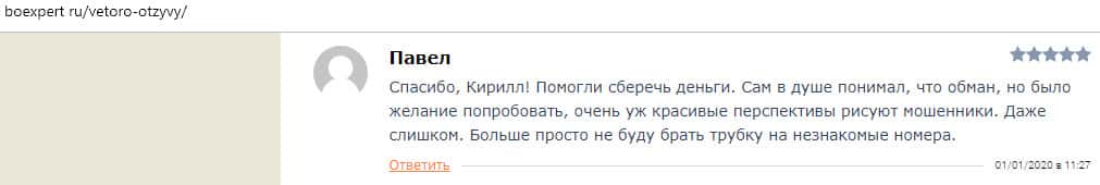 По словам автора следующего отзыва о мошенниках Vetoro io, данная организация пыталась доказать и показать всем, что они серьезно подошли к своей идее. Но это была только видимость. Лохотронщики названивают своим потенциальным жертвам с предложением уже очень легкого заработка, что адекватных людей и настораживает.