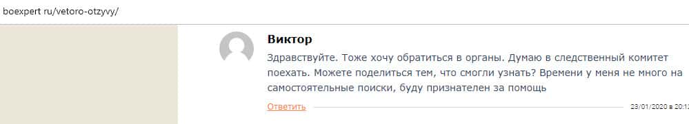 Далее представлена жалоба от человека, который попался на удочку в лохотрон Vetoro io и не знает как теперь вернуть свои вложения. Он готов передать все доказательства и все данные об этих мошенниках, лишь бы ему помогли. Речь идет о не маленькой сумме и время идет не в его пользу.