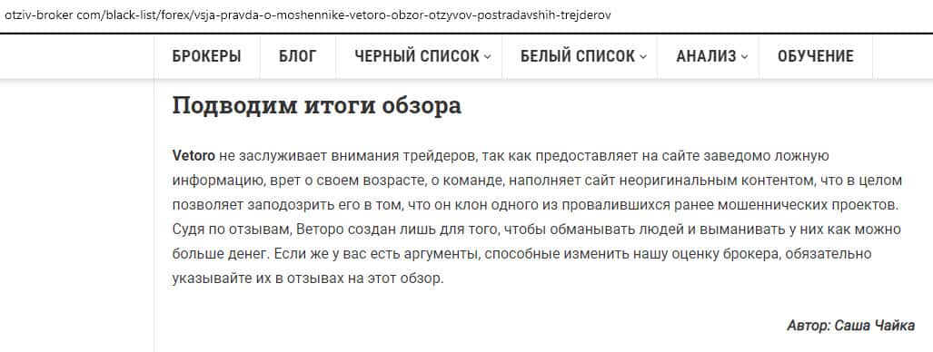 Исходя из вердикта, который размещен в конце данной статьи, контора Vetoro io просто никак не подпадает под критерии брокера и, не узнав ничего нового, они пытаются просто запудрить мозги своей аудитории. Каждому, кто в это поверит придется смириться с потерей вложенных средств и не стоит даже этому потом сопротивляться.