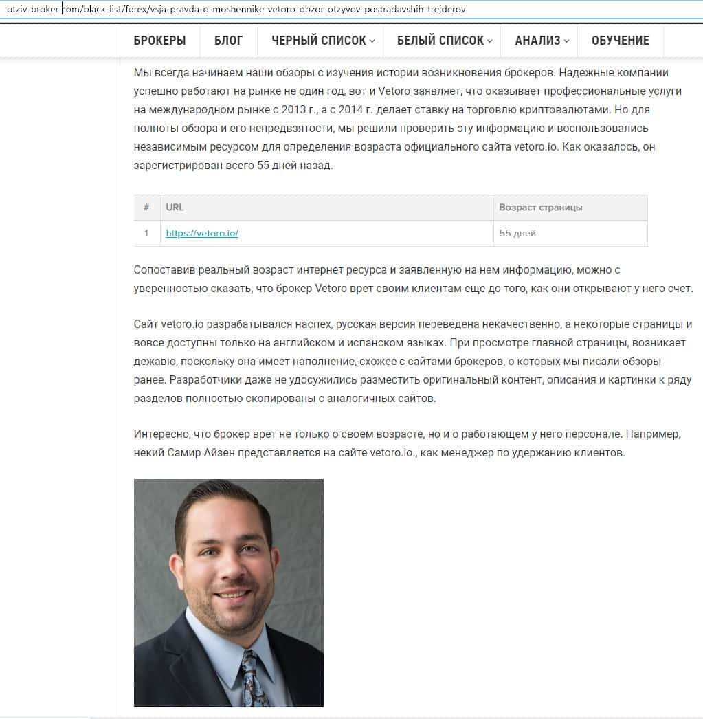 Если рассматривать руководство конторы Vetoro io, то стоит отметить, что они перестали его указывать на своем сайте. Но некоторые сайты все же успели запечатлеть некоего человека, которого просто придумали, а фотографию взяли из социальных сетей. Им был некий человек под псевдонимом Самир Айзен, хотя это его выдуманное имя.