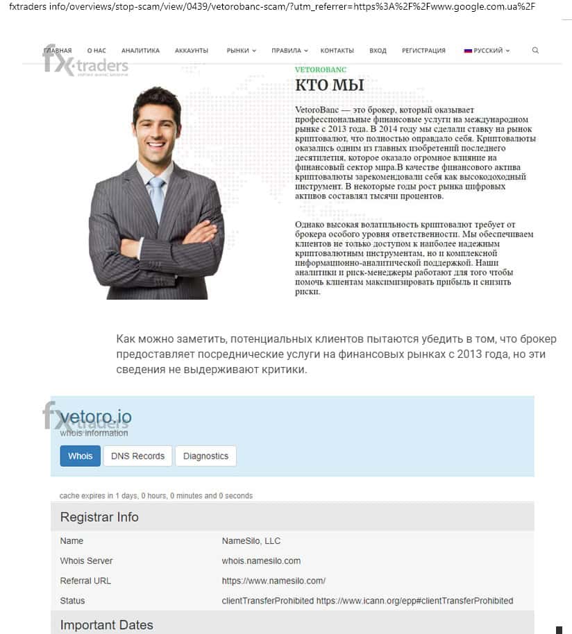 Лохотрон Vetoro io - это брокер, который предоставляет профессиональные финансовые услуги на международном рынке с 2013 года, но эта информация никак не клеится с данными, которые находятся на сторонних ресурсах. Оказывается их домену нет и полгода, что подтверждает откровенное вранье.