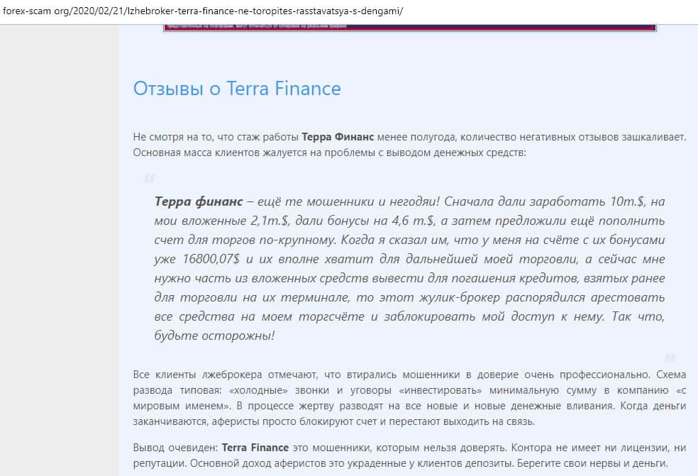 В подтверждение всего вышеупомянутого, контора Терра Финанс, как и лохотрон Веторо и прочая ерунда, следует обратиться к информации в интернете, а именно отзывам реальных пользователей. Жулье наворотило уже множество дел и нет живого места, где не писали об их преступных действиях по отношению к клиентам.