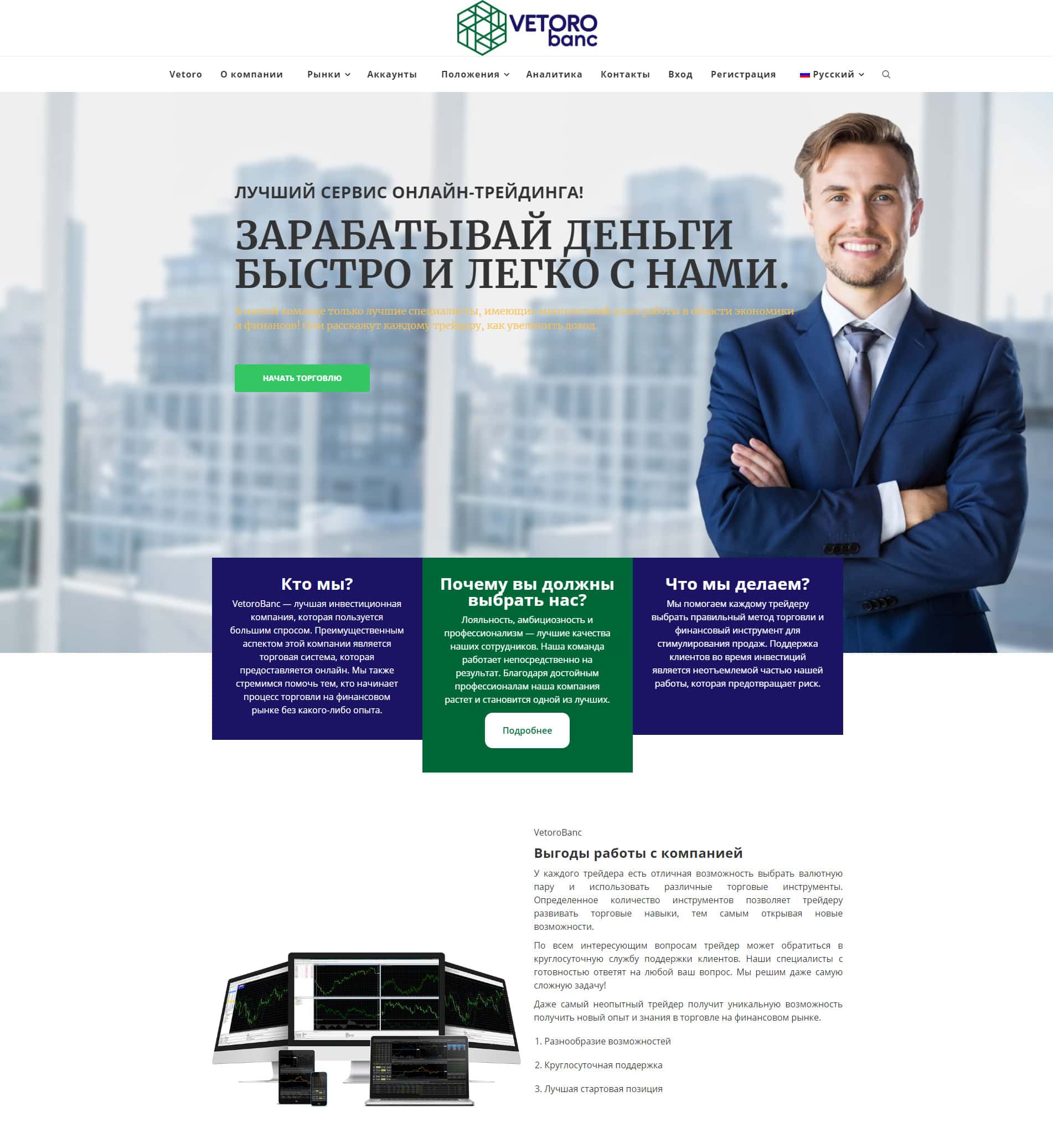 Ресурс конторы Веторо можно назвать рекламным, так как они, вместо того, чтобы рассказать об условиях торговли, просто начинают втирать, что они супер-брокер. Хотя подтверждения своих слов нигде не указывают. Так что не стоит вестись на эту ложь, а тем более вкладывать деньги.