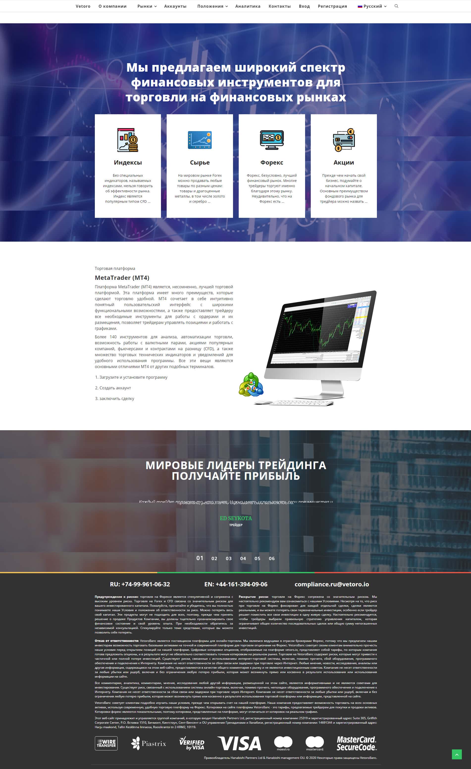 Сайт мошеннической конторы Vetoro io, уже с первых страниц втирают нам, что они знают как зарабатывать деньги, торгуя на рынке Форекс. Никто не знает как это делать, а вот они еще и готовы этому научить даже новичка. Шулера создали довольно красивый сайт, а вот информативность там минимальная.