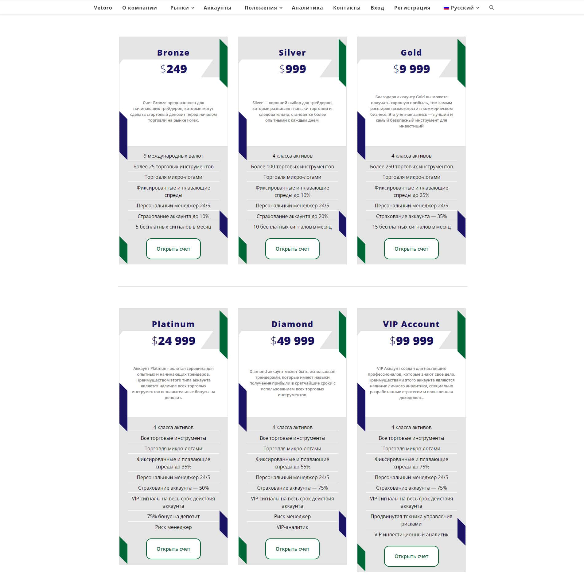 Шулерская кухня Веторо использует несколько счетов, при чем разного уровня. Жулье работает исключительно от 249 долларов до 99 999 долларов, при чем на различных условиях. Чем больше вложите, тем якобы лучше условия. Но, к сожалению, это неправда, так как аферисты сделали это, чтобы привлечь внимание клиентов разного финансового уровня.