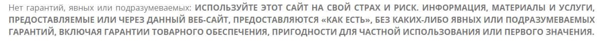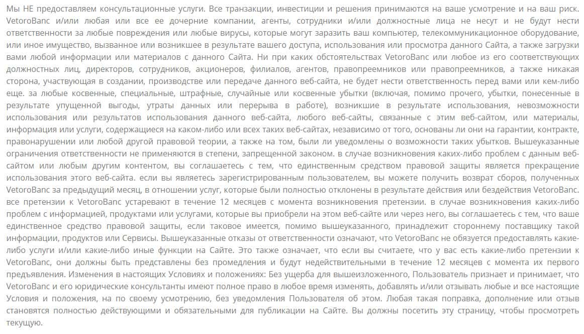 Согласно одному из разделов сайта конторы Vetoro io, где описан момент отказа от ответственности, лохотрон указывает следующий момент. За любые убытки, ущерб, недополученную прибыль и прочие виды негативных последствий из-за действий мошенников Веторо, они нести ответственность не собираются.