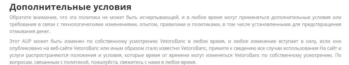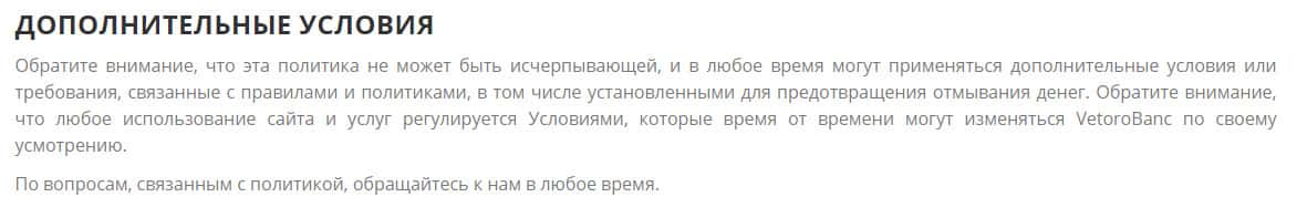 Еще одни дополнительные условия могут быть прописаны в условиях договора конторы Vetoro io, где указывается, что это также касается требований технологических изменений, правилами, либо политикой. Жулье это списывает на безопасность предотвращения отмывания денег, но на самом деле так ловят своих жертв в ловушку.