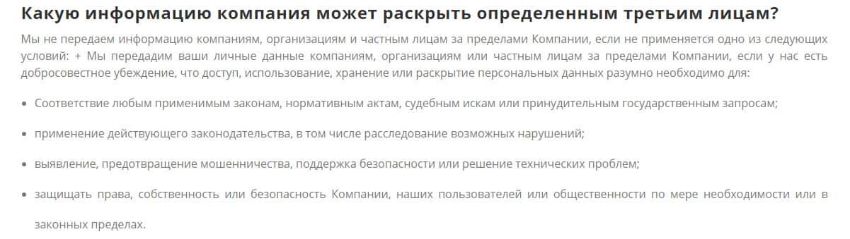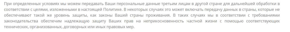 Еще указано несколько определенных условий, когда контора Vetoro io сможет передавать персональные данные третьим лицам. В некоторых случаях, передача может быть даже осуществлена в другие страны и в такой ситуации, жулье просто не будет нести ответственность, если ваши данные будут использованы не по назначению.