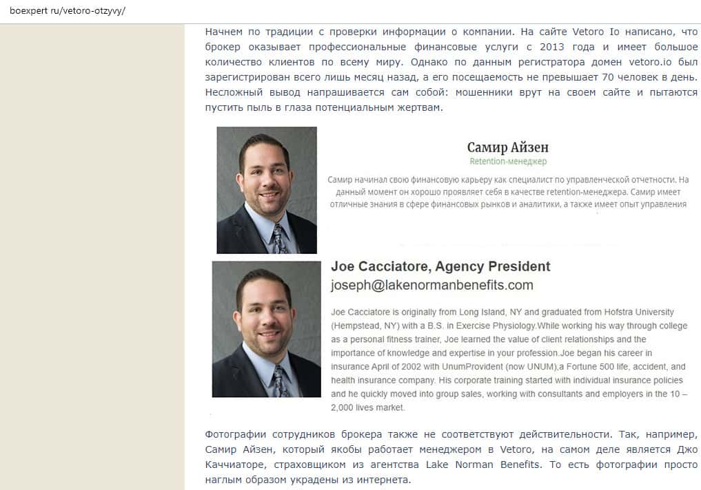 Чтобы рассмотреть руководство конторы Vetoro io мы обратились к стороннему ресурсу, который до этого успел заметить удаленную информацию. Там сказано, что главным менеджером является некий Самир Айзен, который в действительности является Joe Cacciatore и работает он страховщиком в другой компании. Фейковая информация - ничего не скажешь.
