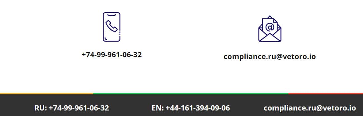 Шулерская контора Vetoro io всеми силами пытается привлечь своих клиентов и для этого даже выставила на показ некоторые контактные данные. Аферисты готовы тесно общаться со своими потенциальными жертвами, дабы как можно скорее забрать у вас деньги. А вот собственно и сами контакты: