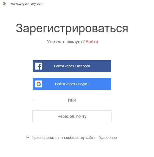 Аферисты WFGermany предлагают зарегистрироваться на их дырявом сайте через социальные сети, таким образом фиксируя всю имеющуюся информацию на странице.