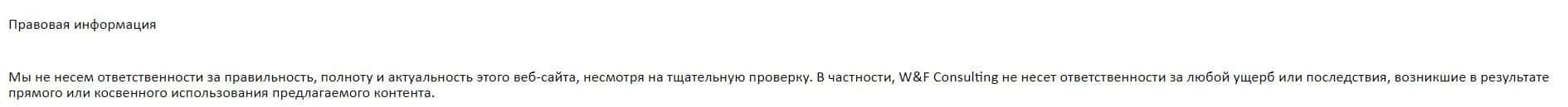 Аферисты W&F Consulting Service конкретного юридического лица с формой собственности не указывают, а вместо этого указали полное название своей компании.