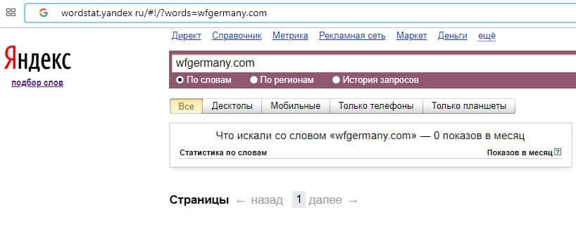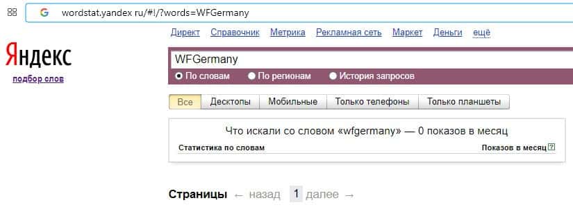 О количестве запросов по бренду название домена компании "wfgermany.com" на Вордстарт Яндекс Ру нет никакой информации.