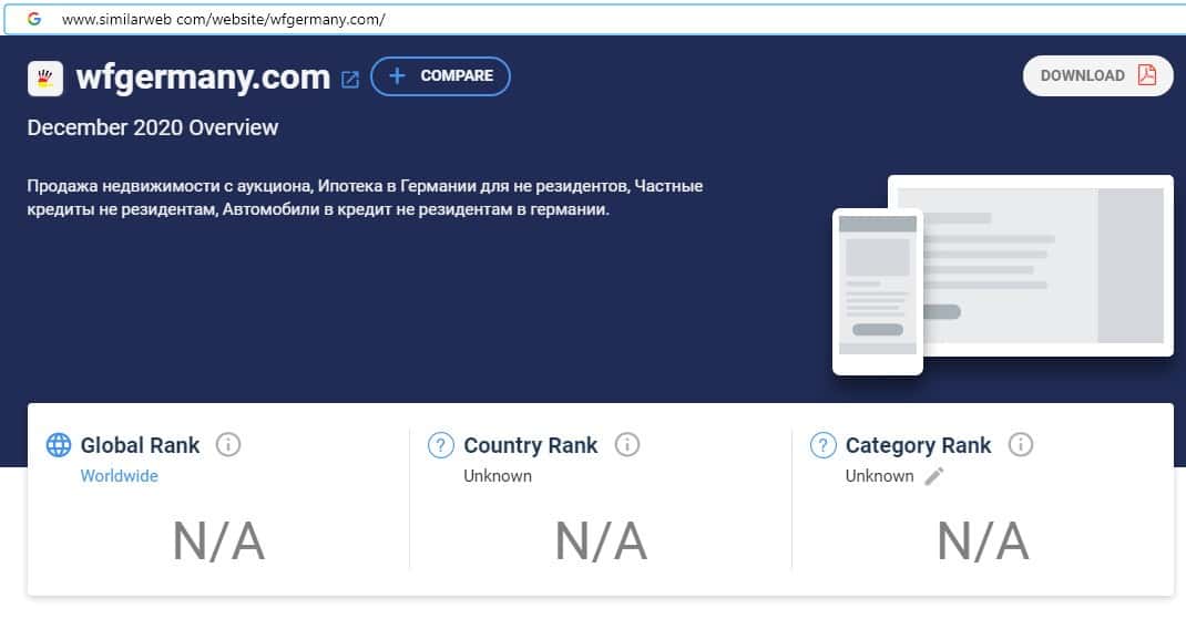 При проверке источников бренда по странам скам-организации WFGermany на сайте similarweb com, информация отсутствует, что является признаком фейкового лохотрона.