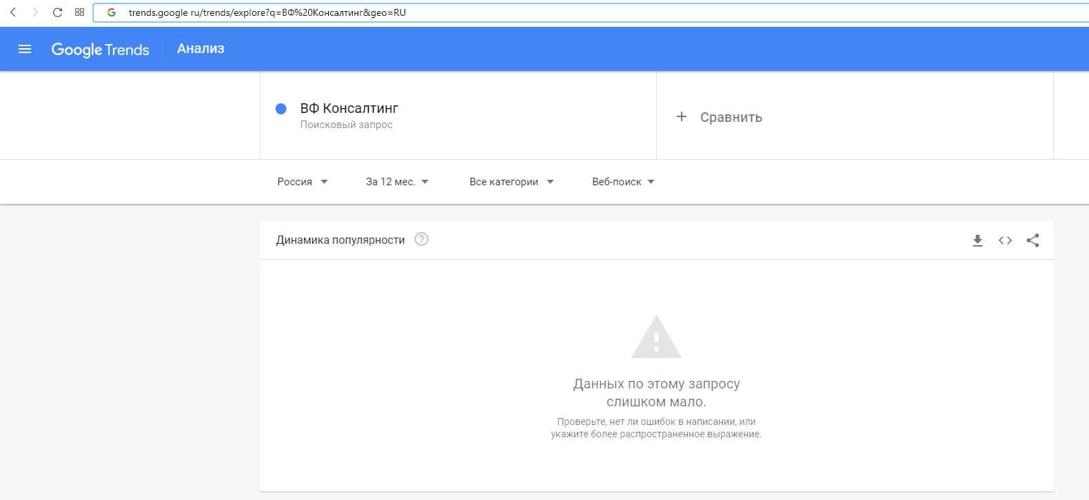 Популярность бренда названия компании на русском языке "ВФ Консалтинг" в поисковике Google полностью отсутствует.