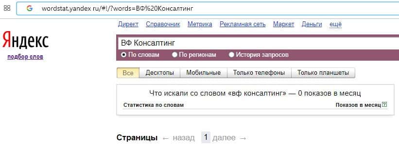 По количеству запросов по бренду названия компании на русском языке "ВФ Консалтинг" на wordstat yandex ru ничего не известно.