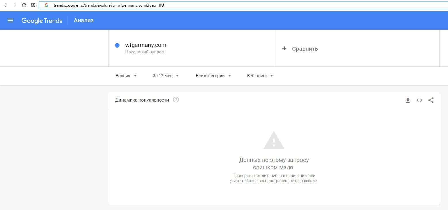 О количестве брендовых запросов название домена компании "wfgermany.com" на Трендс Гугл Ру нет никакой информации.