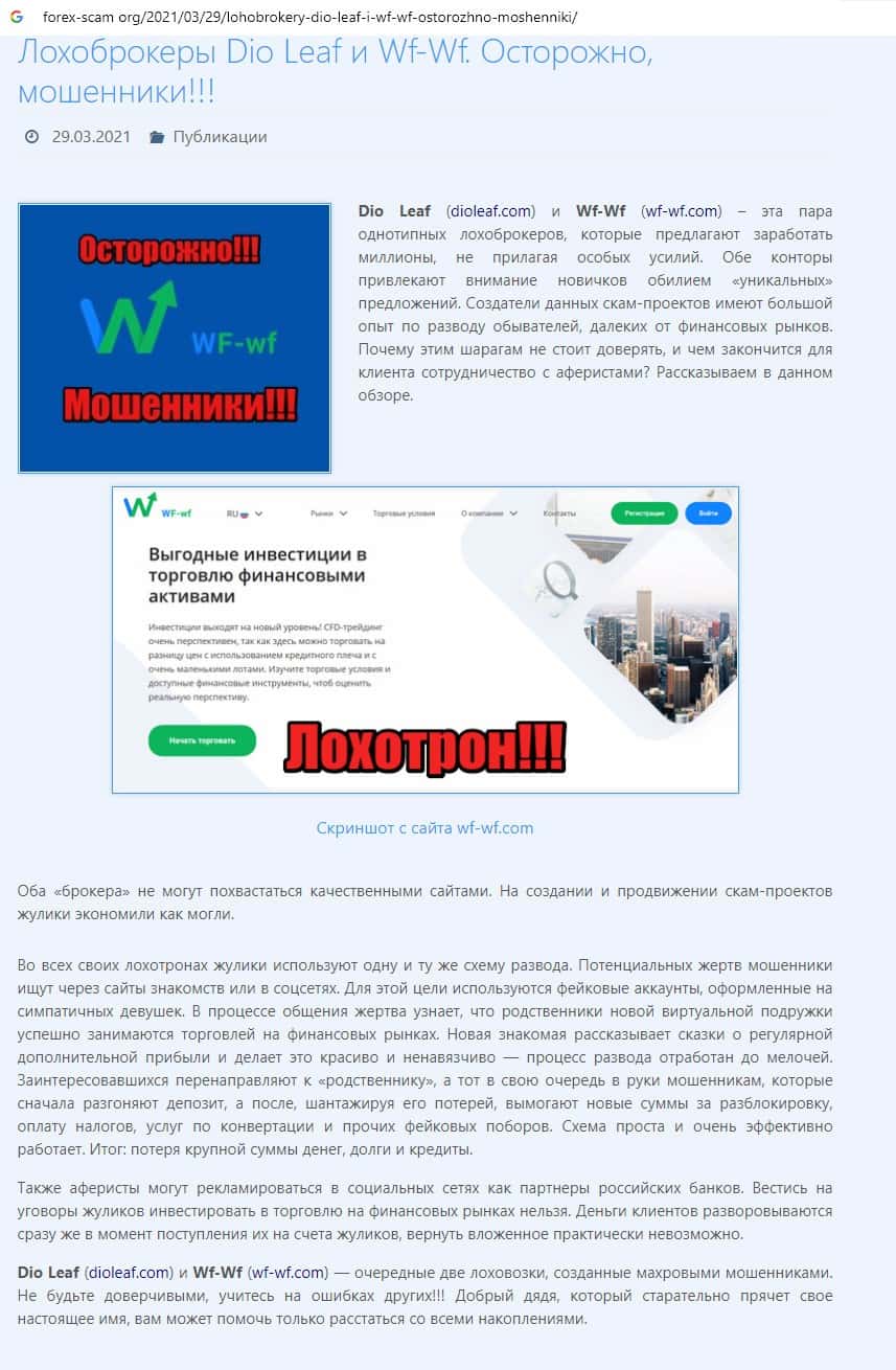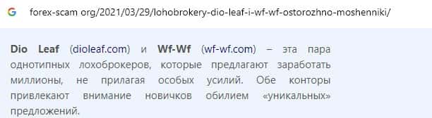 В обзоре предоставленном ниже была отыскана информация о том, что сайт контор WF WF и Dio Leaf однотипный и идентичный по своему содержанию.