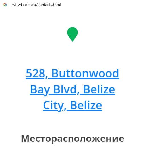 Мошенники WF WF указали адрес местонахождения главного офиса своей компании, который наверняка липовый: