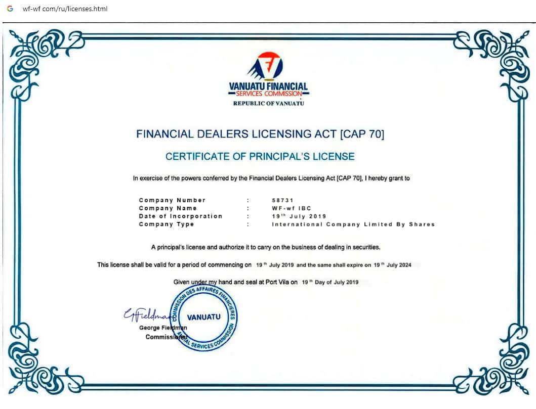Вместо лицензии компании мошенники WF WF на своем дырявом сайте предоставили сертификат о регистрации, который не дает никаких гарантий.