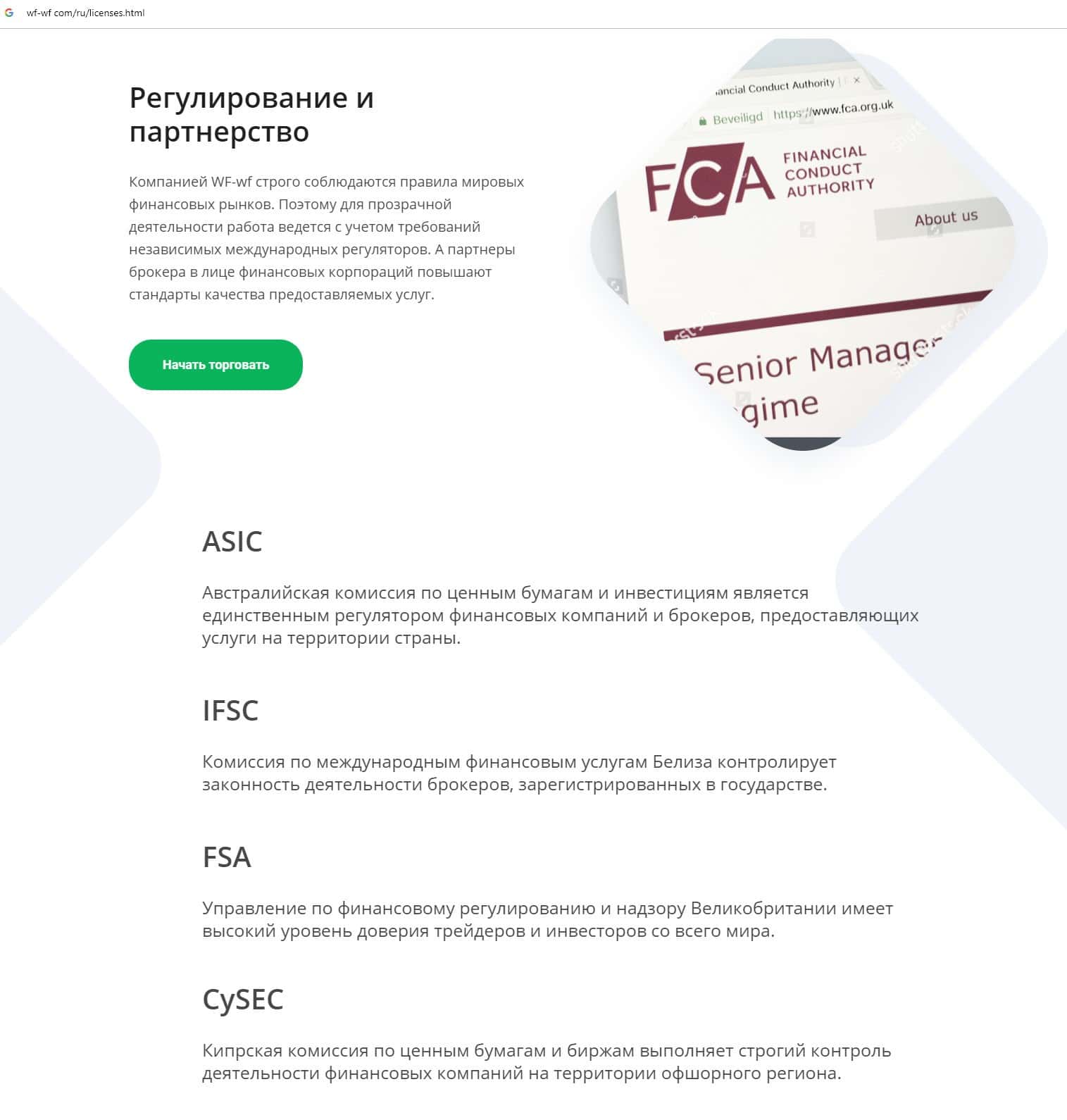 Скам-брокер ВФ ВФ для того, чтобы создать видимость надежной компании указывает то, что деятельность компании регулируется ASIC, IFSC, FSA, а также CySEC.