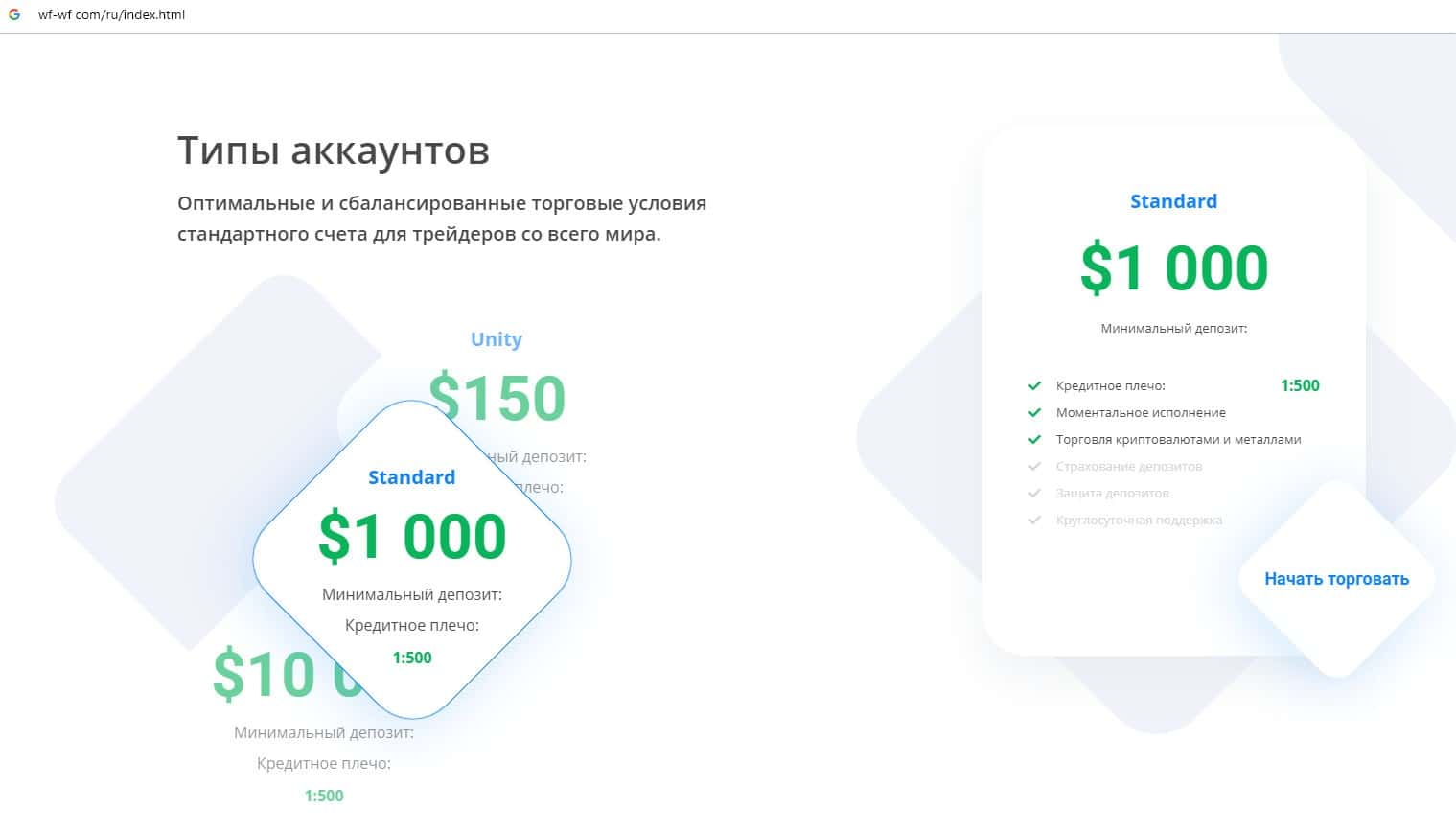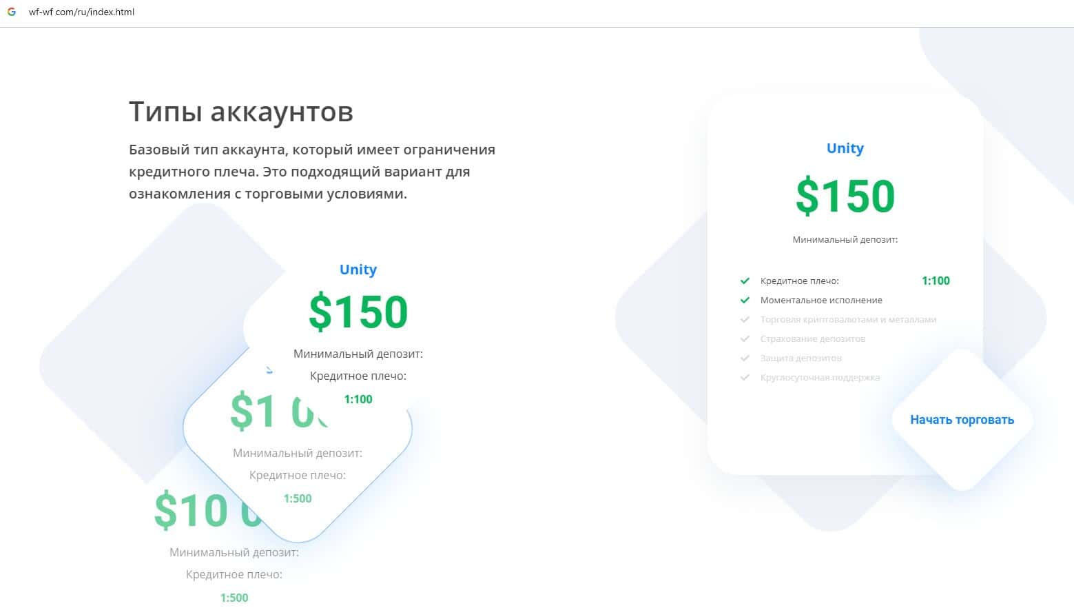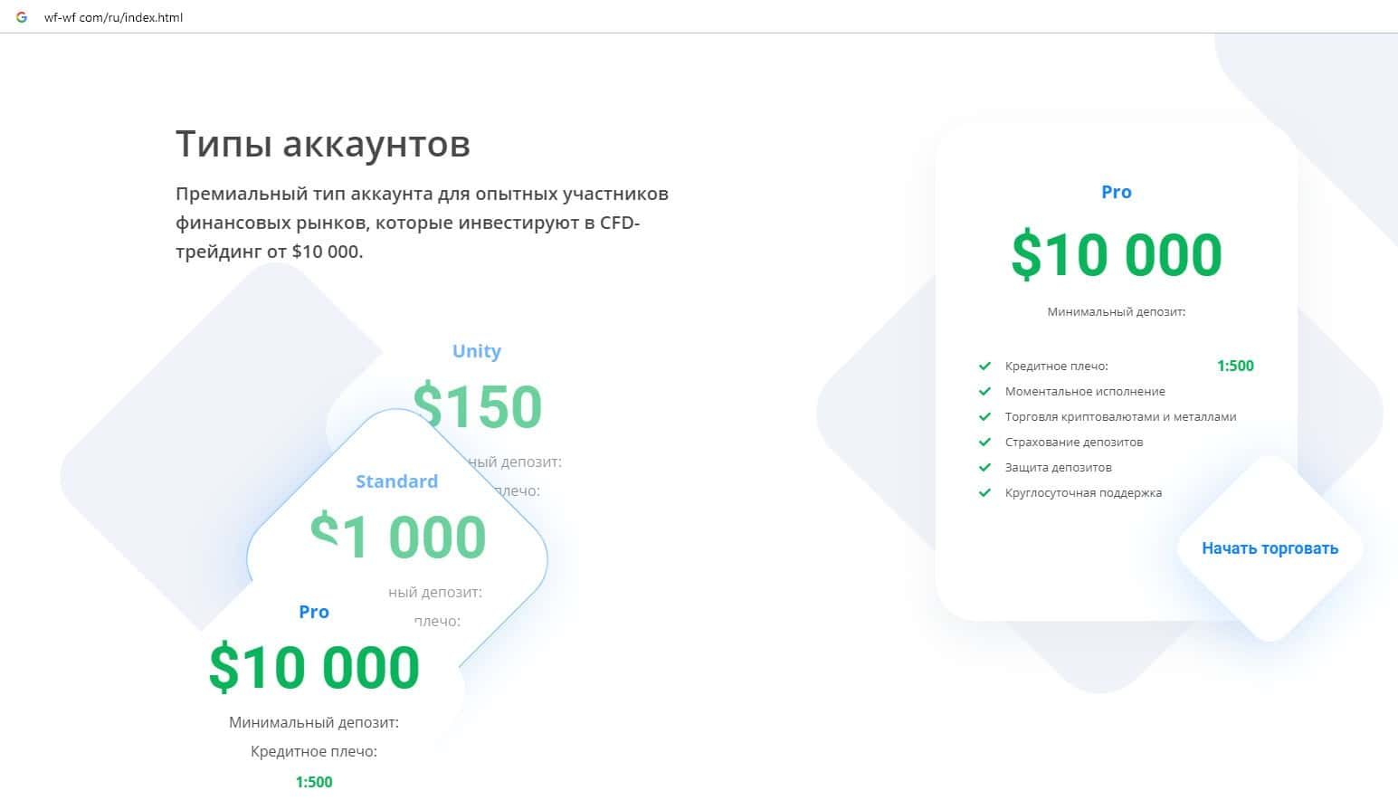 Аферисты WF WF предлагают клиентам на выбор 3 типа торгового счета: Unity, Standard, а также Pro. Реальный Форекс стартует в основном с суммы в 100000 долларов.