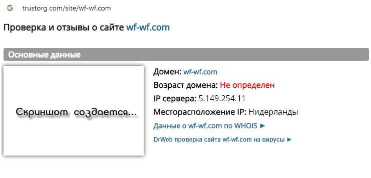 - Отсутствие данных о владельце домена обманщиков WF-wf