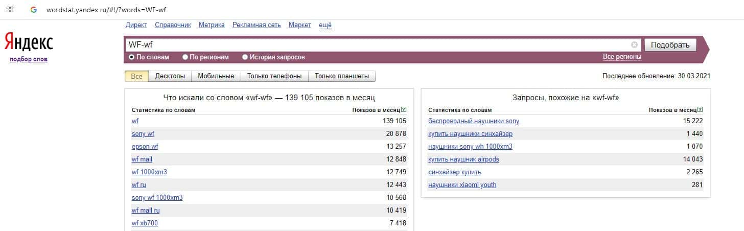 Количество запросов по бренду WF-wf в поисковике Яндекс