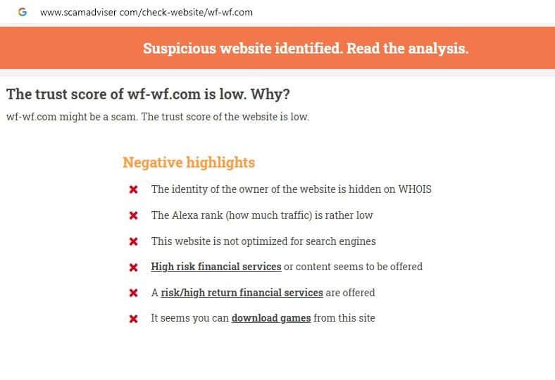 Уровень доверия к сайту жульнической конторы WF WF низкий