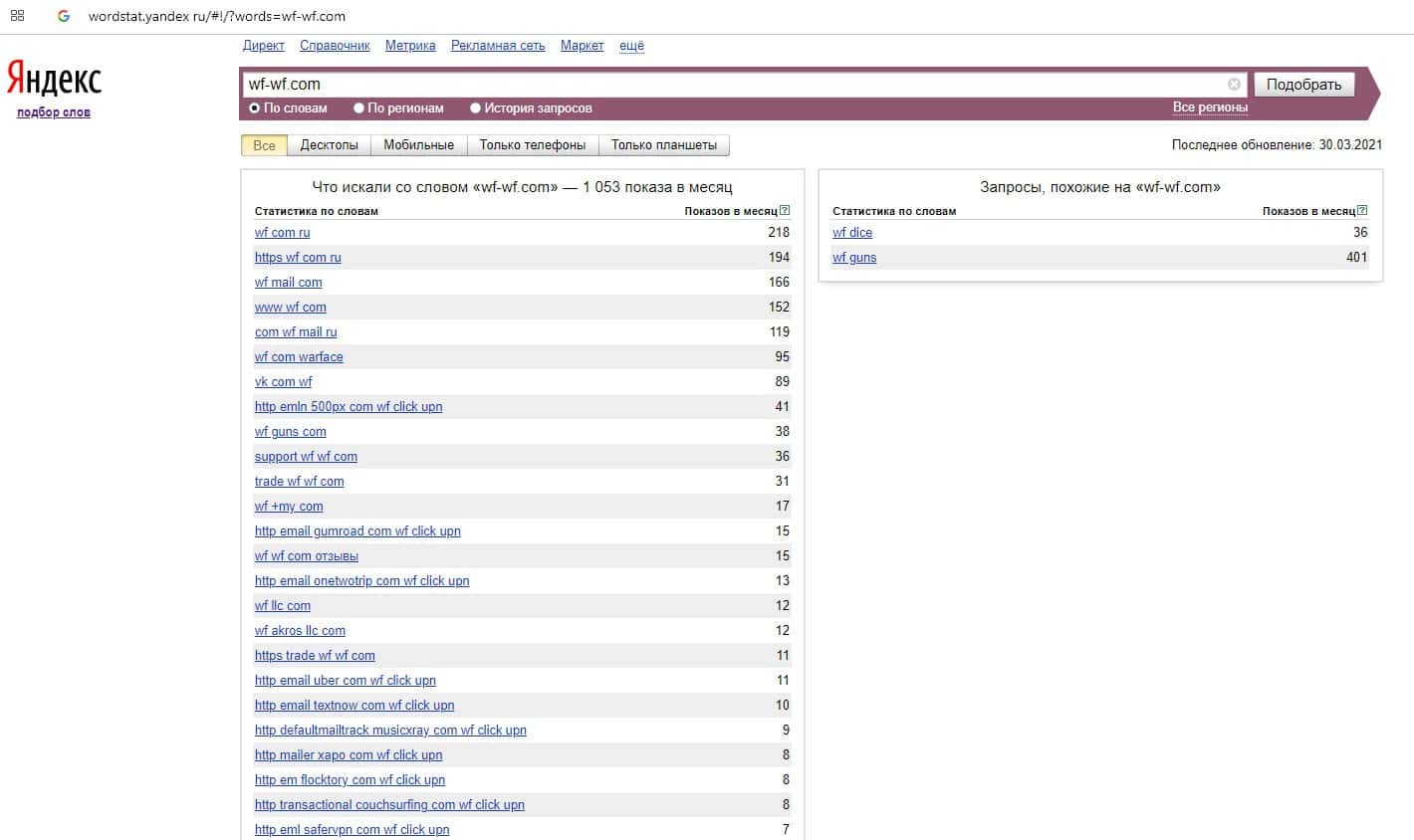 Количество брендовых запросов название домена компании "wf-wf.com" на Вордстарт Яндекс Ру составляет 1063 показа за месяц.