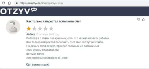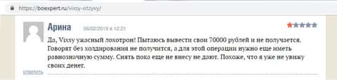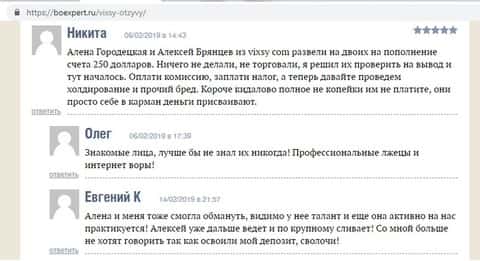 Портал boexpert ru просто лопается от количества жалоб на кидалово от шарашкиной конторы Vixsy. Женщину бессовестно кинули на 70 штук рублей, но этого жуликам мало – они требуют от жертвы еще столько же за вывод денег. Наглости их просто нет предела.