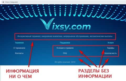 Практически все разделы скам-портала Vixsy, касающиеся FAQ, Тарифов, Безопасности или Терминала, не рабочие. Никаких обязательных для трейдера данных об условиях торговли, спредах, плече, ставках, поставщиках ликвидности на портале нет и в помине.