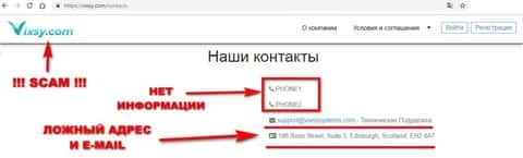 При запросе контактов на сайте конторы Vixsy появляется сплошная лажа: номеров телефонов нет, настоящий адрес лохотронщиков совсем иной: Пресненская набережная, дом 8, строение 1, в Москве. Да и совершенно другой e-mail указан в их соглашении, которое они присылают клиентам: support@vixsy com.