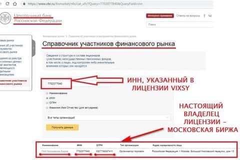 Сверим номер ИНН, указанный в лицензии Виксси, с базой данных официального регулятора российских брокеров ЦБ РФ. Оказывается, что жулье подмахнуло разрешение ПАО Московская Биржа – крупнейшего российского биржевого холдинга. Дешевка, нуль – вот что такое Vixsy, а не брокер.