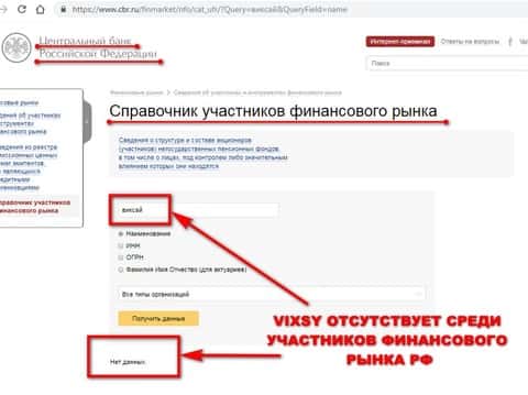 Проверим данные, приведенные нахалами Vixsy в лицензии, которую они нагло подсовывают своим будущим жертвам на сайте Центрального банка Российской Федерации. По наименованию Виксай в базе данных нет никакой информации.