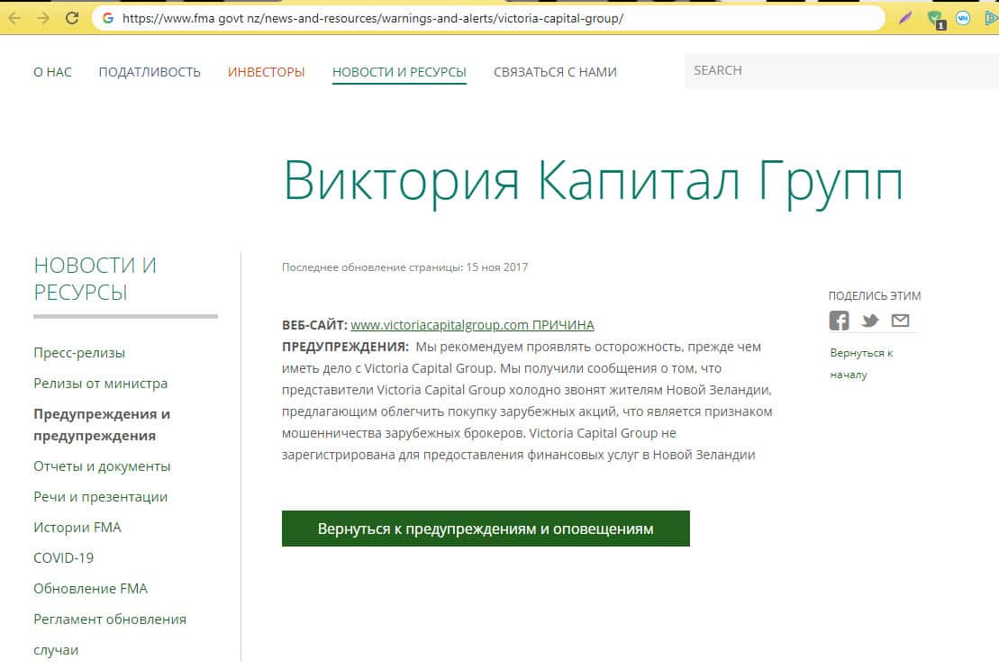 - На странице fma govt nz написана статья об аферистах Victoria Capital