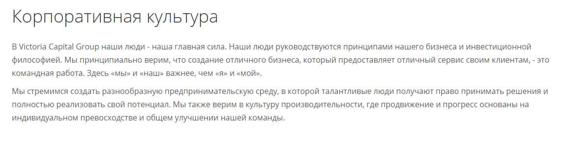 - Совершенно лишний раздел сайта, где аферисты Victoria Capital рассказывают о себе