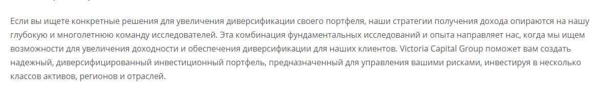 Мошенники Victoria Capital твердят о том, что, если вы ищете конкретные решения для увеличения диверсификации своего портфеля, то именно их стратегии получения дохода будут идеальным вариантов, ибо они опираются на их глубокую и многолетнюю команду исследователей. Красиво придумано, не правда ли.