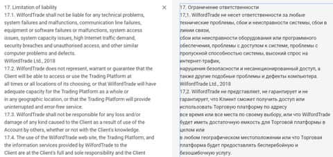 Помимо отсутствия лицензии, также стоит отметить один из разделов договора, который предлагает подписать своим клиентам форекс-лохотрон Вилфорд Трейд. Это ограничение ответственности, где сказано, что WilfordTrade не несет ответственность за любые убытки, которые понесет клиент работая с ними.