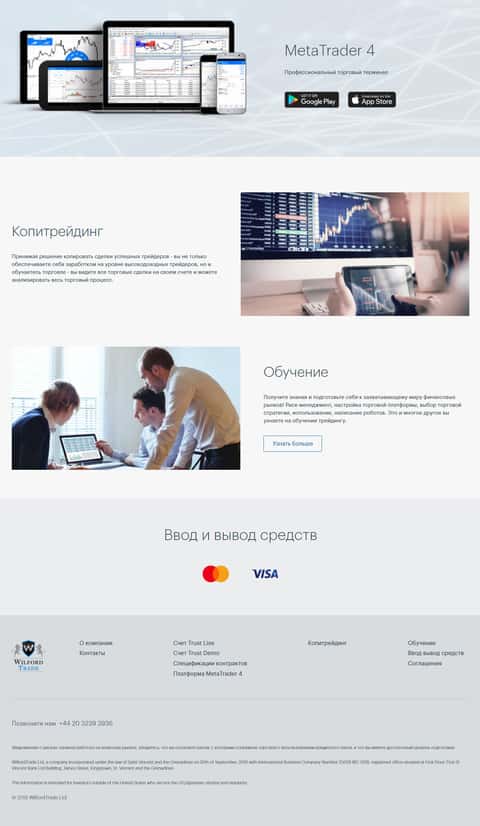 Во второй части сайта конторы WilfordTrade мы только удостовериваемся, что данная организация форекс-лохотрон, так как жулики используют торговую платформу Мета Трейдер 4, а также предоставляют копитрейдинг, где вам будут вешать лапшу о супер-сигналах на которых можно заработать.