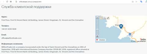Оффшорный форекс-лохотрон Вилфорд Трейд не боится рассказывать о своих контактах и месте прописки, так как для большинства кинутых жертв находятся вне поля досягаемости. Если конечно вам очень захочется с ними связаться, когда жулики украдут деньги, то вот их контакты: