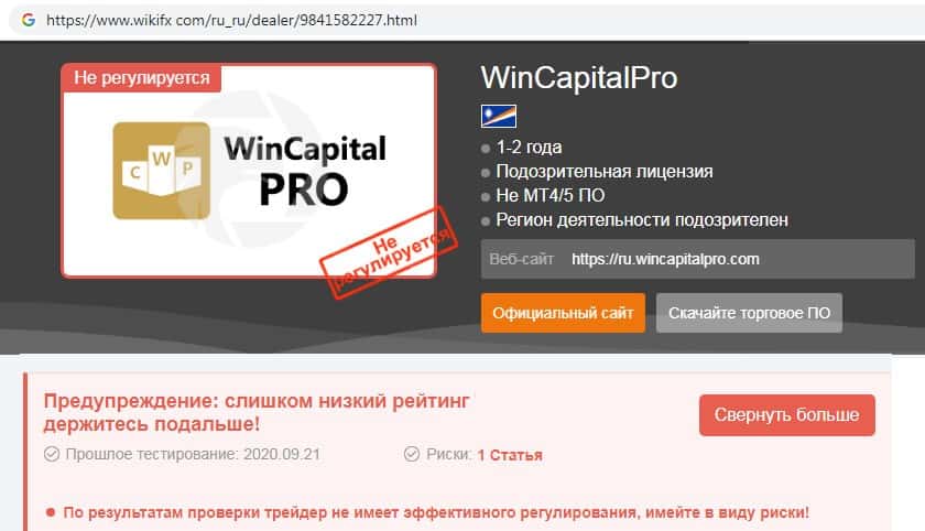 Отсутствие информации о торговой платформе Вин Капитал Про