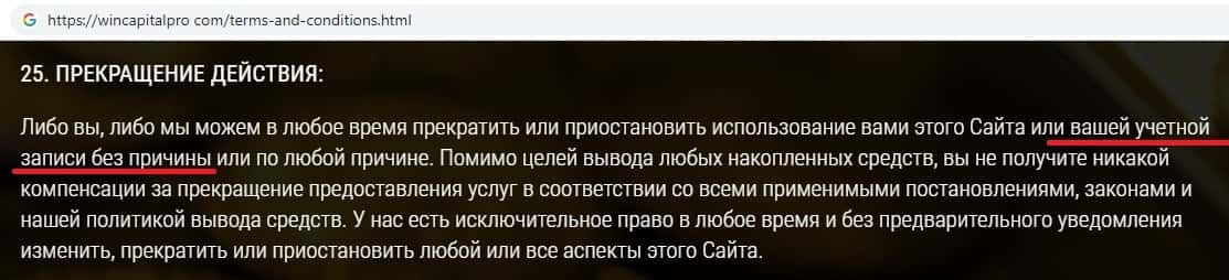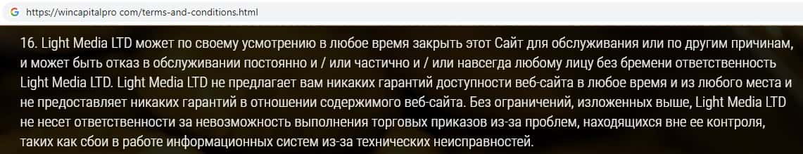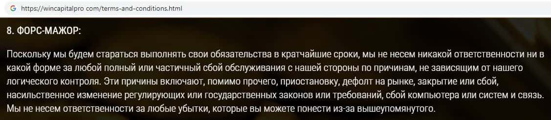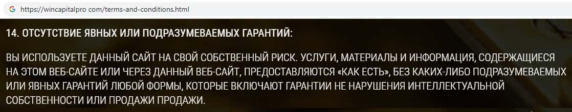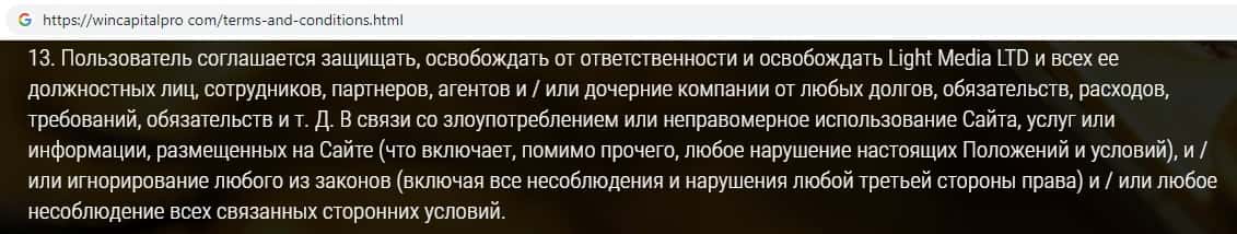 Жулики Вин Капитал Про уведомляют пользователей о том, что абсолютно за все ответственность будет нести исключительно клиент, но никак не компания.