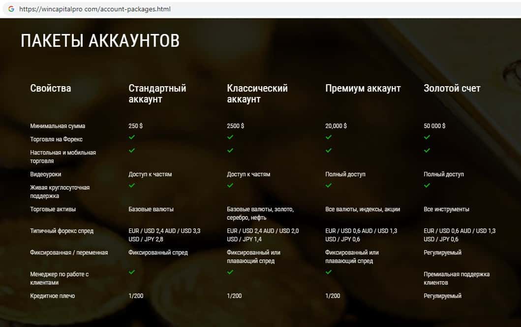 Мошенники Вин Капитал Про предлагают клиентам на выбор 4 типа торгового счета: Стандартный, Классический, Премиум и Золотой. Реальный форекс стартует в основном с суммы в 100000 $.
